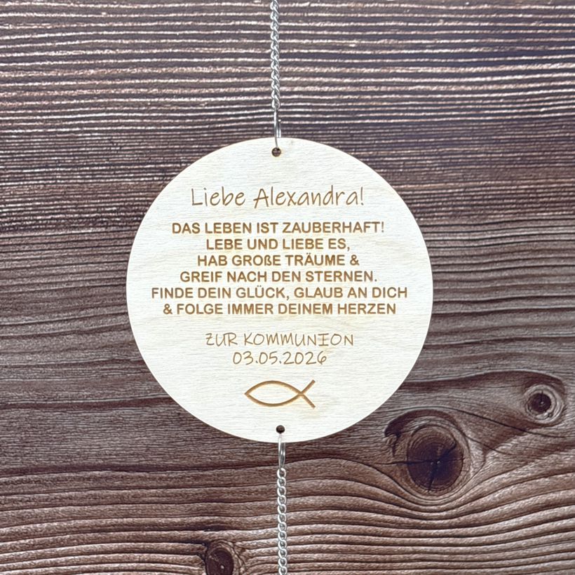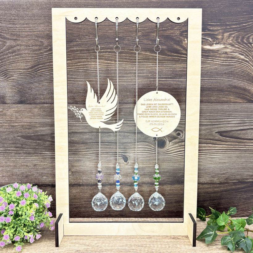 Ein personalisierter Sonnenfänger mit funkelndem Kristall und Holzschild mit Fischsymbol – ein besonderes Geschenk zur Kommunion und eine bleibende Erinnerung für das Kommunionkind.